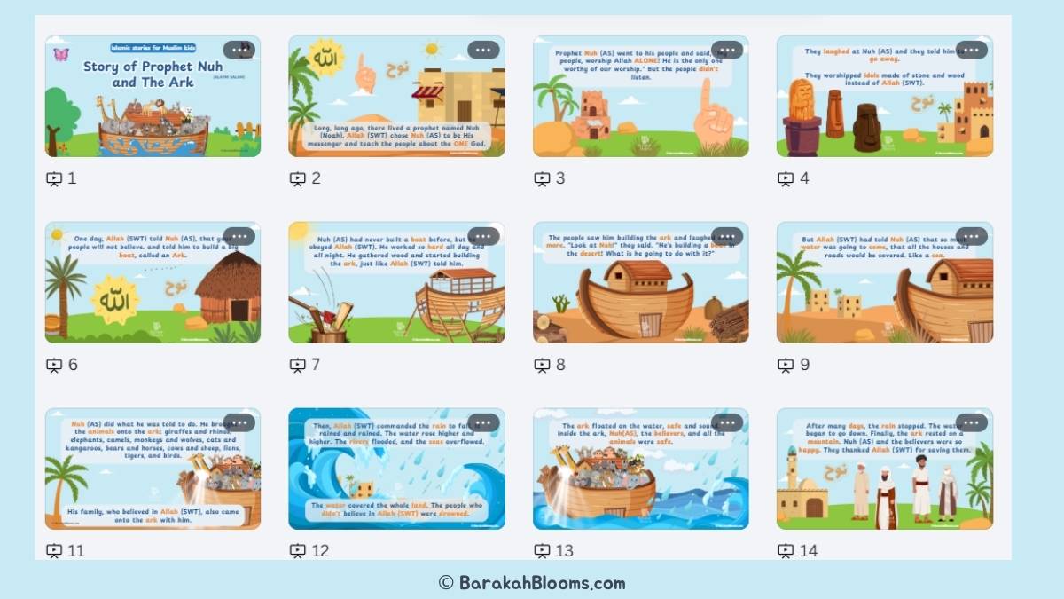 The story of Prophet Nuh (AS) is one of the most exciting and important stories in the Quran. It teaches children that doing the right thing isn’t always easy, but Allah always helps those who believe. This PowerPoint & PDF Lesson brings this epic event to life with colorful visuals and simple, child-friendly storytelling.
